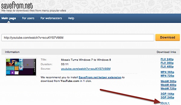 Lưu ý: Theo mặc định, định dạng video được chọn cho bạn tải về là MP4. Bạn có thể nhấp chuột vào đường link “More” để xuất hiện thêm những định dạng như FLV và 3GP (cho thiết bị di động).