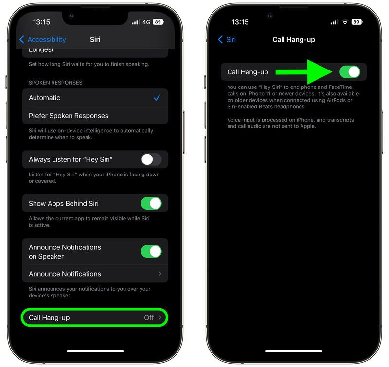 Sau khi thiết lập, khi đang thực hiện cuộc gọi, người dùng có thể nói "Hey Siri, hang up" để cúp máy.