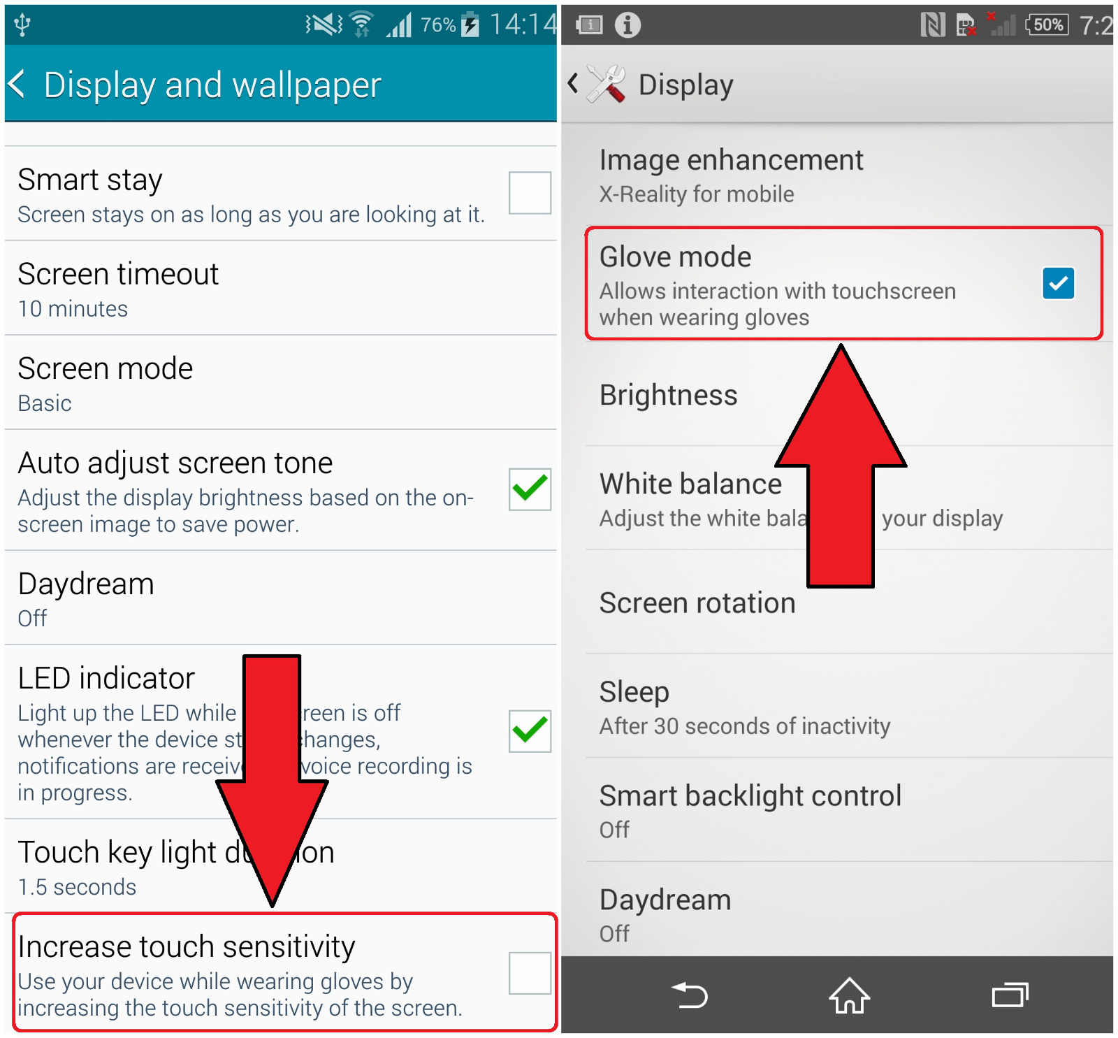 Nếu Nokia nổi tiếng với màn hình Lumia siêu nhạy, có thể dùng với găng tay, Sony và Samsung cũng không kém cạnh, tuy nhiên bạn phải kích hoạt chức năng này trên thiết bị. Trong thời tiết lạnh giá của mùa đông, đeo găng dùng điện thoại tỏ ra hữu ích. Các mẫu máy hỗ trợ bao gồm Note 4, Galaxy S5, Note 3, Galaxy S4, Xperia Z3, Xperia Z2, Xperia Z1.