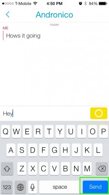 Bước 5: Nhấn nút “Send” ở góc dưới bên phải bàn phím để gửi tin nhắn. Nút màu vàng ở cuối tin nhắn không có chức năng gửi tin nhắn. Nút này để khởi động chat video.