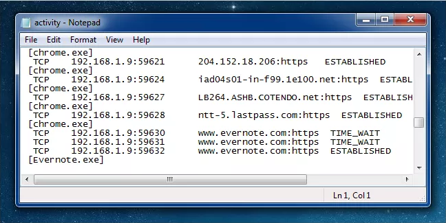 Sau đó, chỉ cần mở file activity.txt để xem kết quả hoặc gõ thêm dòng lệnh activity.txt để mở trong Notepad. File kết quả sẽ liệt kê toàn bộ quá trình đang diễn ra trên máy tính (trình duyệt, ứng dụng IM, email…) đã kết nối Internet trong 2 phút vừa qua. Nếu nhìn thấy tên hoặc địa chỉ website lạ, bạn có thể tra cứu trên Google để xem nó là gì. Đây có thể là chức năng hệ thống mà bạn không biết, song nếu là trang web xấu, hãy tìm trên Google một lần nữa để loại bỏ nó.