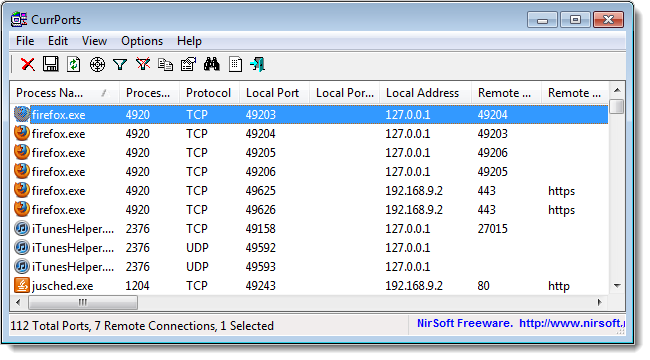 Với mỗi cổng CurrPorts liệt kê, thông tin về tiến trình được hiển thị. Bạn có thể chọn các kết nối rồi đóng chúng lại, sao chép thông tin vào clipboard hoặc lưu trong file HTML, XML hoặc file text.