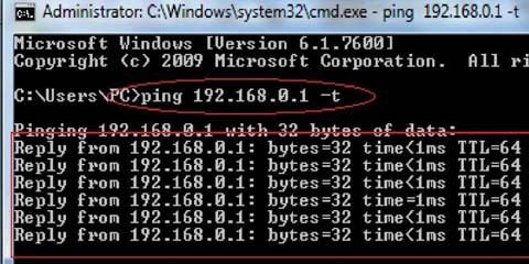 Gõ ping 192.168.0.1 –t . Nhấn phím Enter
