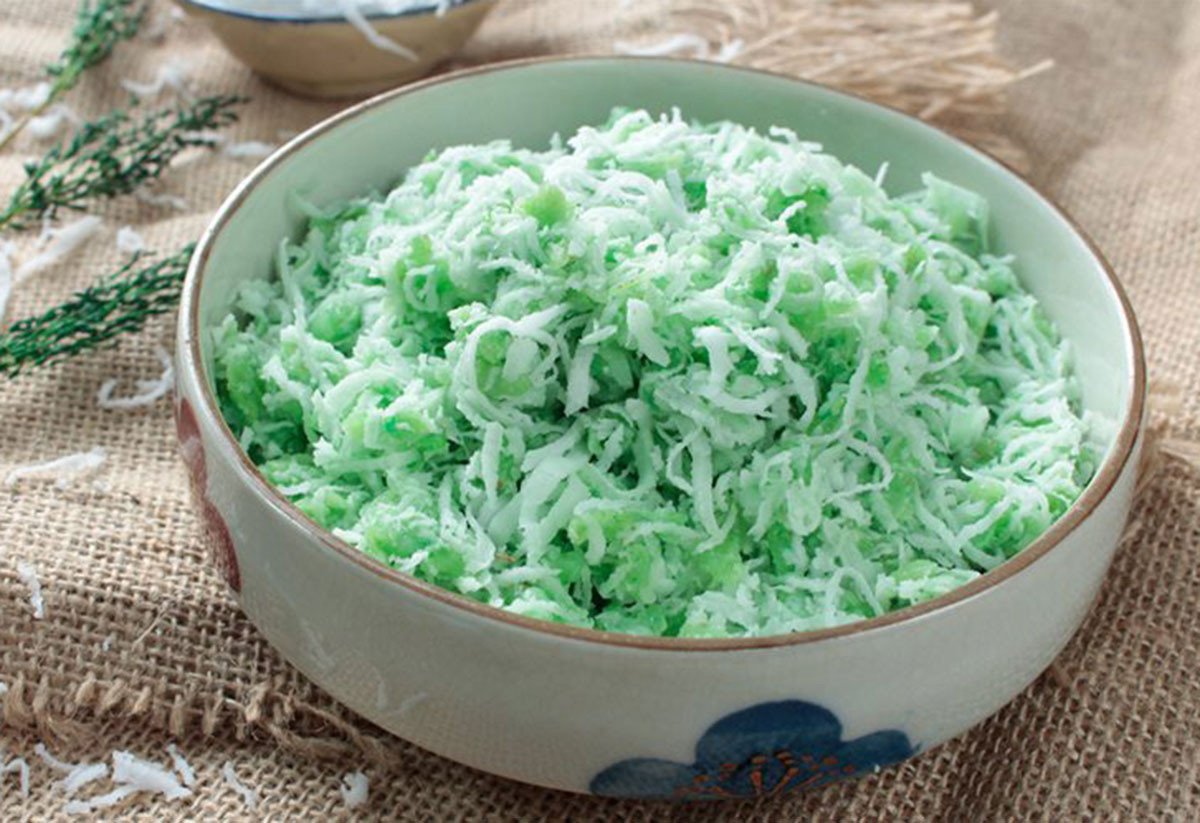 Nước cốt dừa hòa tan với 50g đường và 1/4 thìa cà phê muối rồi đun sôi. Khi nước cốt dừa sôi thì đổ 2 thìa canh nước lá dứa vào, tiếp tục đun cho nước cốt dừa sôi lại.