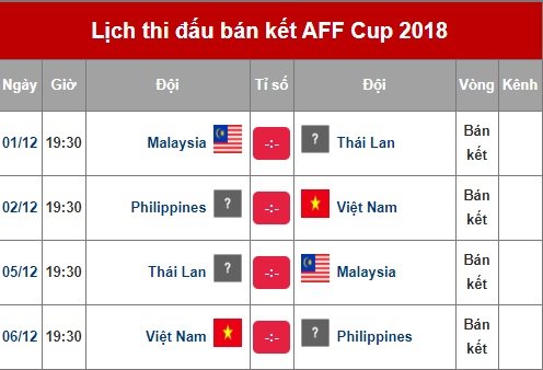 Lịch thi đấu bán kết AFF Cup 2018 |