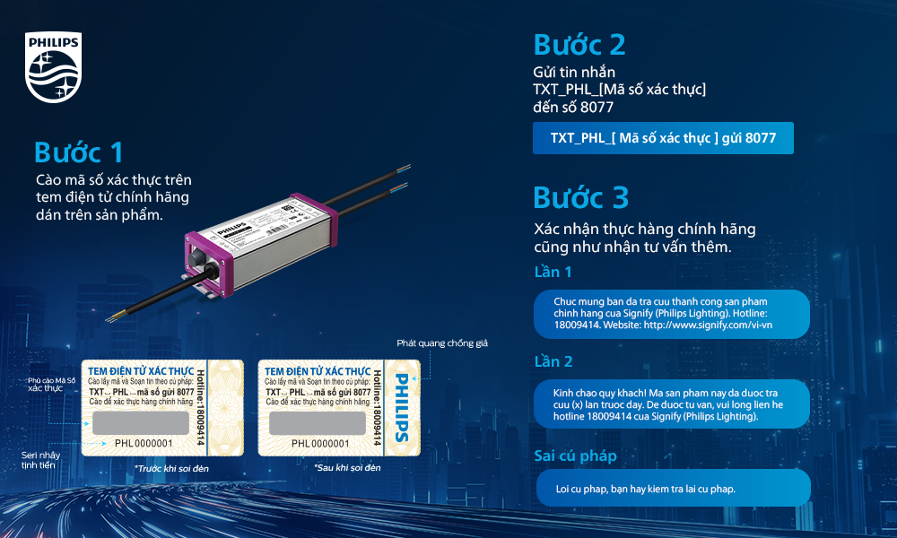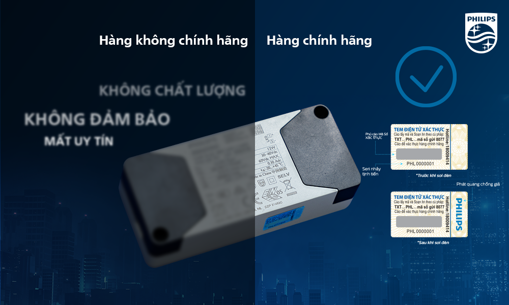 Minh bạch nguồn gốc: Hàng chính hãng Signify luôn được cung cấp đầy đủ hóa đơn và minh bạch về nguồn gốc, giấy tờ. Signify cũng tiên phong áp dụng tem xác thực chính hãng trên dòng sản phẩm bộ nguồn LED nhằm hỗ trợ khách hàng phân biệt hàng chính hãng với hàng không rõ nguồn gốc, tránh các nguy cơ nhầm lẫn hàng trà trộn, hay kém chất lượng. Ngoài ra, các đơn vị sản xuất, các đối tác OEM cũng có thể sử dụng tem xác thực để hưởng chế độ hậu mãi chính thức từ hãng sản xuất.
