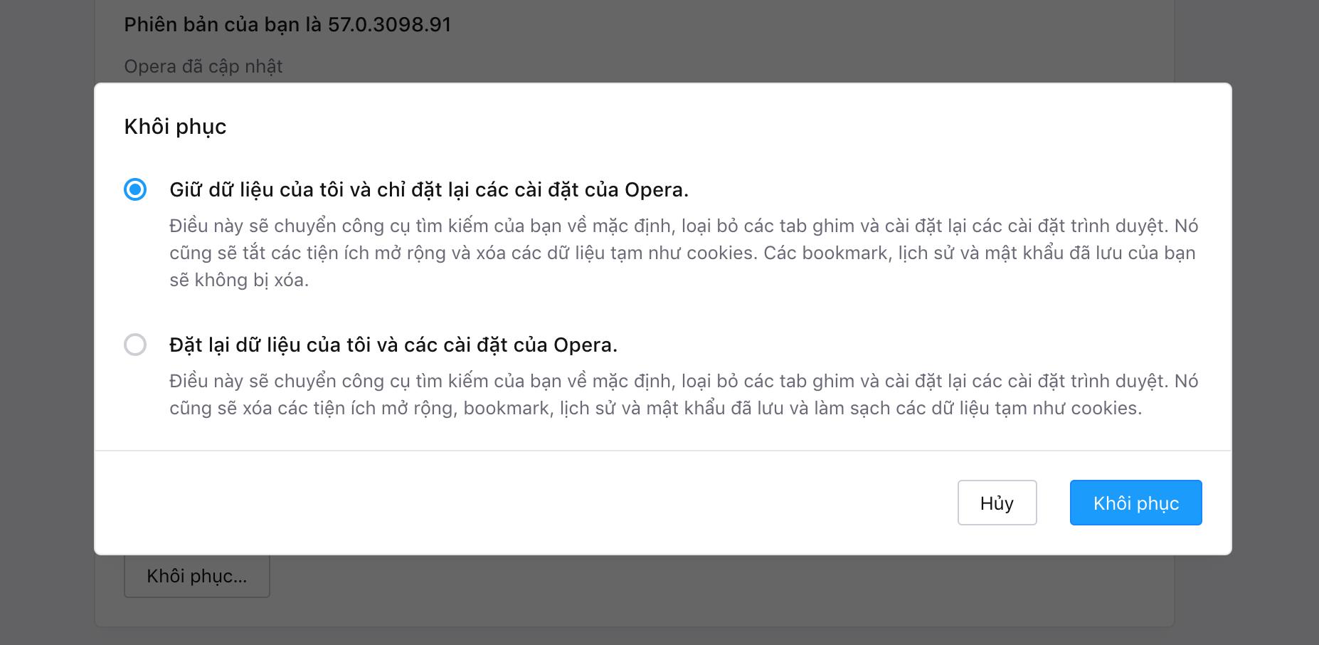 - Keep my data and only reset Opera settings (Giữ lại dữ liệu của tôi và chỉ đặt lại các cài đặt của Opera): Tùy chọn này sẽ chuyển công cụ tìm kiếm của bạn về mặc định, loại bỏ các tab ghim và cài đặt lại các cài đặt trình duyệt. Nó cũng sẽ tắt các tiện ích mở rộng và xóa các dữ liệu tạm như cookie. Các bookmark, lịch sử và mật khẩu đã lưu của bạn sẽ không bị xóa.