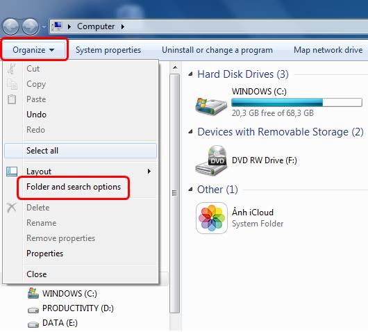 Bước 1: Mở cửa sổ Computer, trên thanh Menu, chọn Organize / Folder and search options