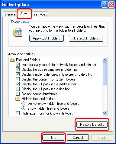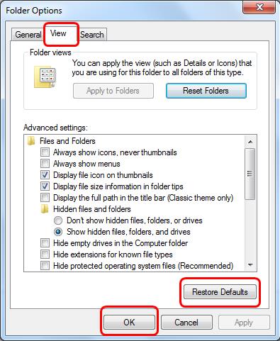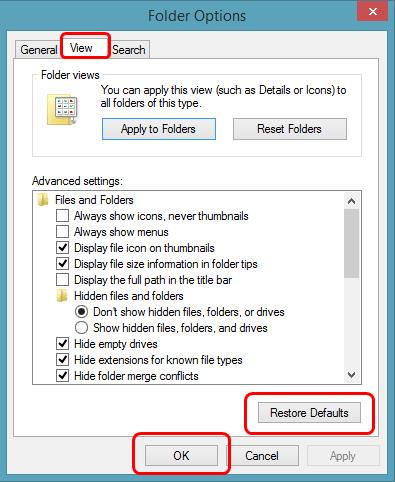 Bước 3: Trong cửa sổ Folder Options, bạn chọn View, bấm Restore Defaults và bấm OK để hoàn tất
