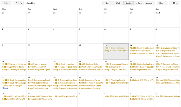 Trong khi không khí của ngày hội bóng đá World Cup 2014 đang nóng lên từng ngày, chắc hẳn việc nắm rõ lịch thi đấu của giải đấu hấp dẫn này là điều các tín đồ túc cầu giáo đều mong muốn. Bài viết sẽ hướng dẫn bạn dùng Google Calendar để nhập lịch thi đấu World Cup 2014 và tra cứu bằng cả máy tính lẫn di động. Cách thực hiện như sau:
