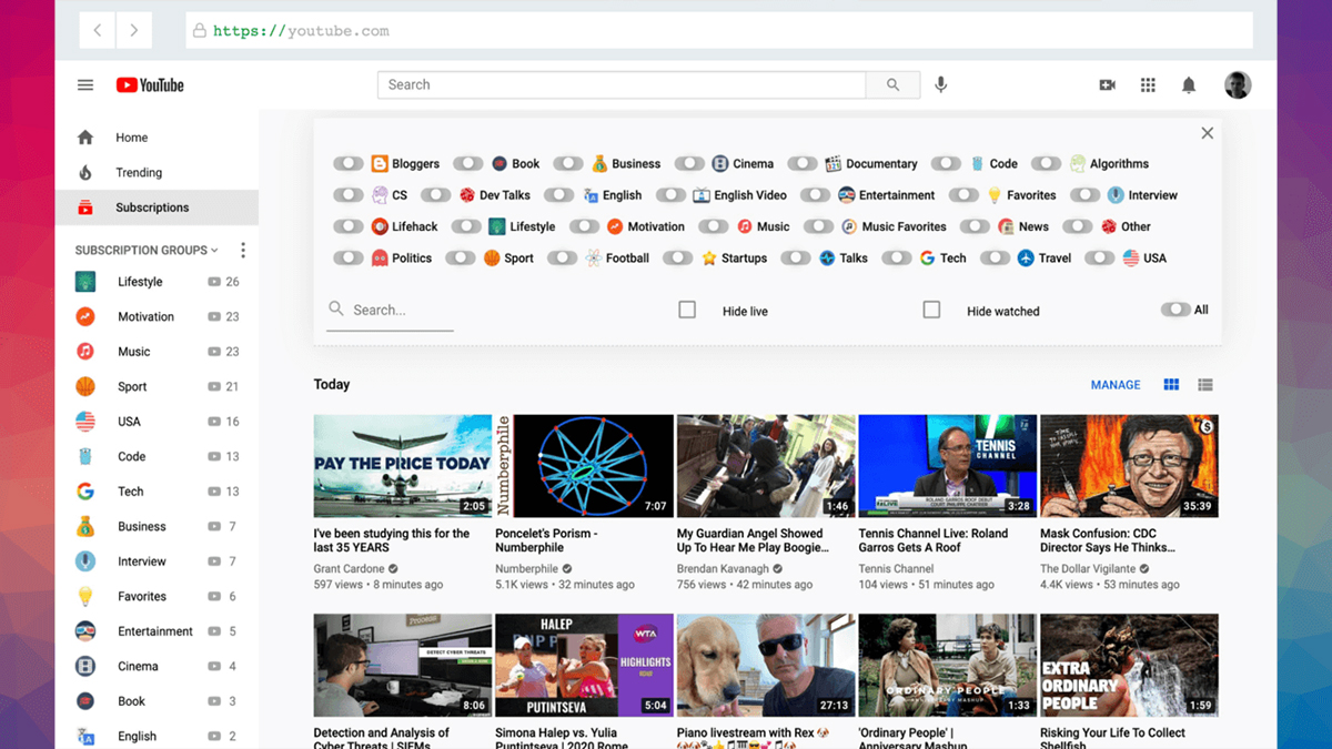 Nền tảng Youtube đã sinh ra rất nhiều tiện ích mở rộng và plug-in do bên thứ ba cung cấp giúp người dùng kiểm soát nội dung. Ví dụ với PocketTube, tiện ích này cho phép bạn sắp xếp các kênh đã đăng ký vào các thư mục để bạn dễ theo dõi hơn. Nhờ đó, bạn có thể chia các kênh theo từng chủ đề hoặc mức độ quan tâm.