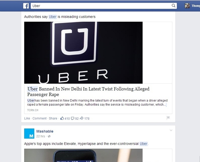 Tiếp theo, bạn thay chỗ từ-khóa bằng từ mình muốn tìm kiếm. Sau khi thay xong bạn nhấn Enter để truy cập. Lúc này kết quả trả về sẽ là các bài đăng từ bạn bè, các Fanpage bạn "like" có chứa từ khóa mà bạn tìm kiếm. Ví dụ như hình ảnh dưới đây là kết quả trả về khi tìm kiếm bằng từ khóa Uber.