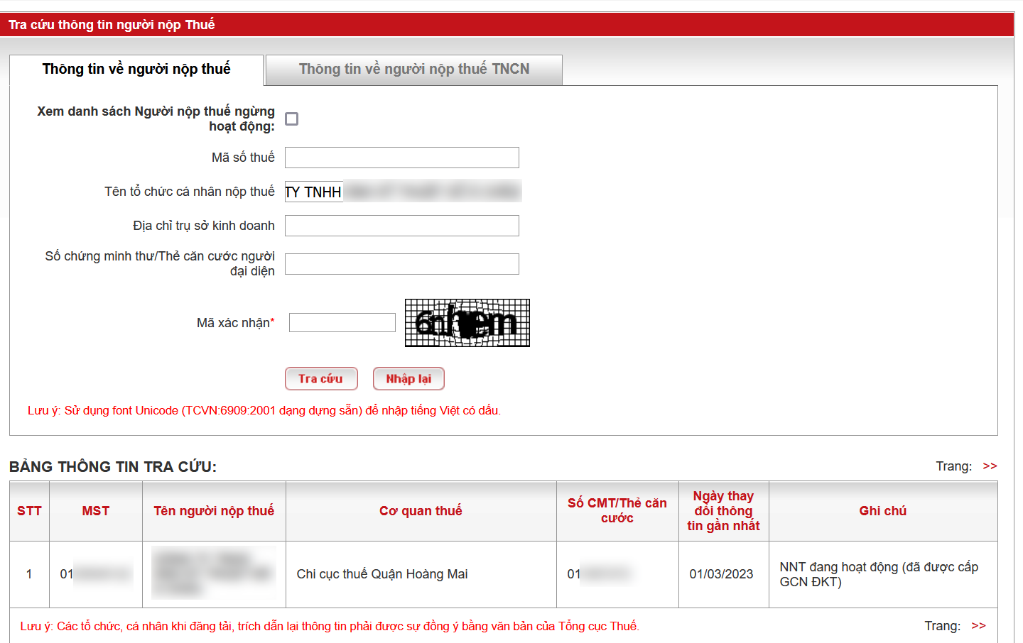 Kết quả trả về bao gồm các thông tin: Mã số thuế, Tên công ty/người nộp thuế, Cơ quan thuế, Số CMT/Thẻ căn cước, Ngày thay đổi thông tin gần nhất và Ghi chú.