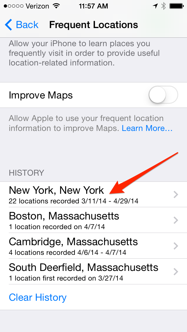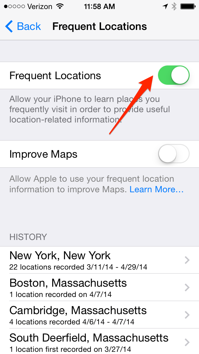 iPhone thu thập dữ liệu địa điểm của người dùng nhiều hơn những gì họ nghĩ thông qua cài đặt địa điểm thường đến “Frequent Locations”. Khi bạn di chuyển, iPhone lưu lại chúng cùng thời gian lưu lại địa điểm đó. Sau nhiều lần lặp lại như vậy, nó đánh dấu địa điểm này thành “địa điểm thường đến”. Thông minh hơn, nó còn dự đoán được địa chỉ nơi làm việc của bạn dựa trên thời gian lưu lại trong ngày, địa chỉ nhà dựa theo giờ buổi tối. Ngoài ra, nó còn theo dõi cả nhiều địa điểm khác như nhà của bạn bè, nhà hàng ưa thích…