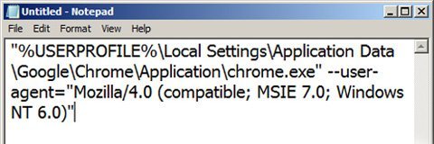 "%USERPROFILE%\Local Settings\Application Data\Google\Chrome\Application\chrome.exe" --user-agent="Mozilla/4.0 (compatible; MSIE 7.0; Windows NT 6.0)"