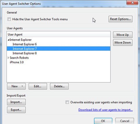 Vào menu Firefox > Add-ons > Extensions, nhấn nút Options nằm bên dưới tên tiện ích User Agent Switcher.