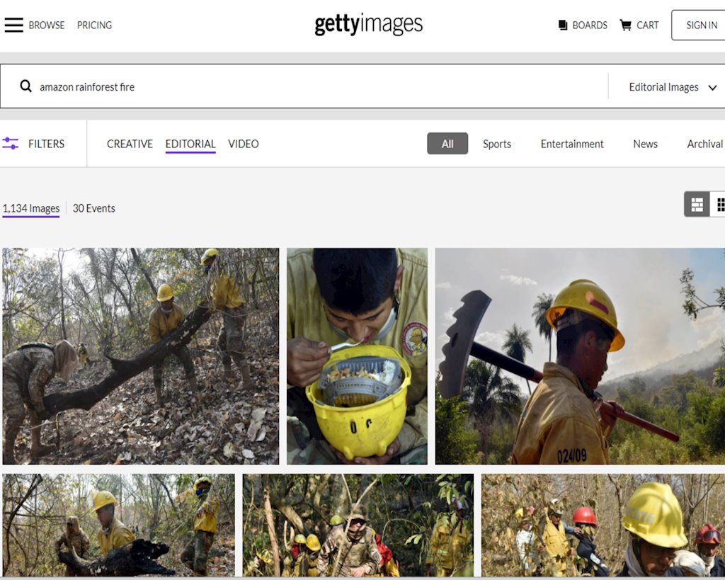 Ví dụ, bạn truy cập Getty Images và tìm kiếm “Amazon rainforest fire”, khi click vào kết quả tìm kiếm, hình ảnh sẽ hiện thông tin về người chụp ảnh, địa điểm, thời gian chụp.