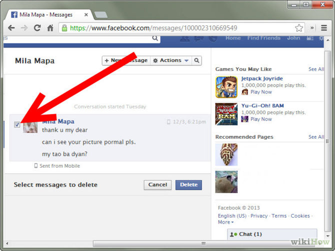 Bước 4: Tick vào ô vuông đứng trước mỗi tin nhắn rồi nhấn nút “delete” (xóa). Để xóa toàn bộ cuộc hội thoại, chọn “Delete Conversation”.