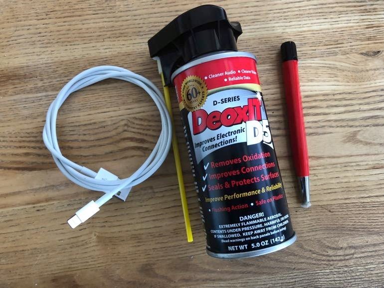 Vì vậy, cách giải quyết bây giờ sẽ là xử lý vấn đề cáp sạc Lightning bị oxy hóa. Bạn có thể dùng một chút dung dịch DeoxIT D5 - giúp loại bỏ sự ăn mòn trên các bảng mạch và các linh kiện, đặc biệt là những thứ đã tiếp xúc với nhiều yếu tố gây oxy hóa. Nếu không có dung dịch DoxIT D5, bạn có thể sử dụng một cục tẩy bút chì, một chút cồn xát và loại bỏ quá trình oxy hóa.