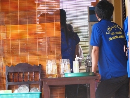 | Trong khi nữ nhân viên mặc kiểu nửa ta nửa Tây, nam nhân viên lại mặc áo full có quảng cáo cà phê. |