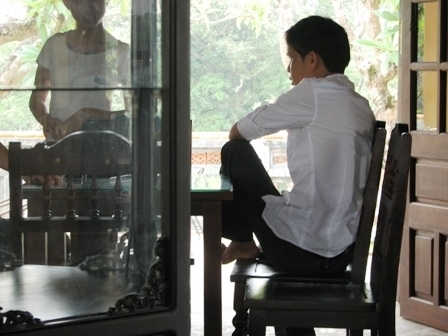 | Một nam quản lý của quán ngồi với tư thế thiếu lịch sự tại di tích. |