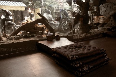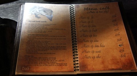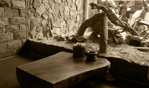 Những chiếc bàn làm bằng đá được đặt trong một nền ánh sáng yếu sẽ khiến những ai đến quán lần đầu sẽ có cảm giác hơi lo sợ như bị lạc vào một khu rừng hoang dã.