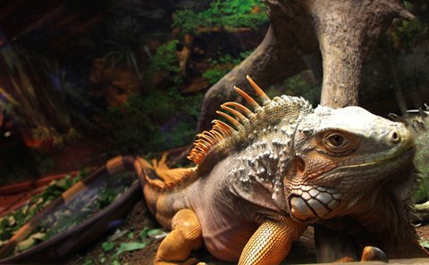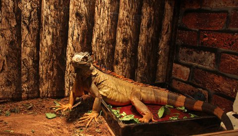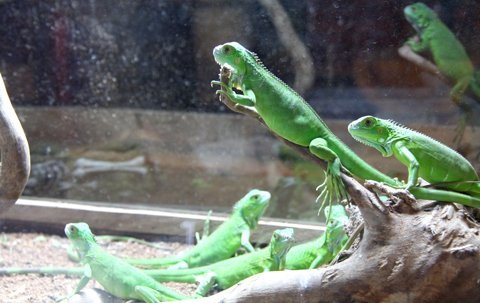 Những con thằn lằn xanh được nuôi chung ở một chuồng kính lớn