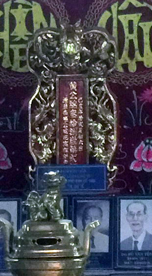 | Bài vị cậu Hai Miên. Dòng chữ lớn ở giữa ghi: “Huỳnh Công Miên tam thập bát tuế đệ nhị hạng chi vị” có nghĩa là: “Bài vị của cậu Hai Huỳnh Công Miên mất năm ba mươi tám tuổi”. |