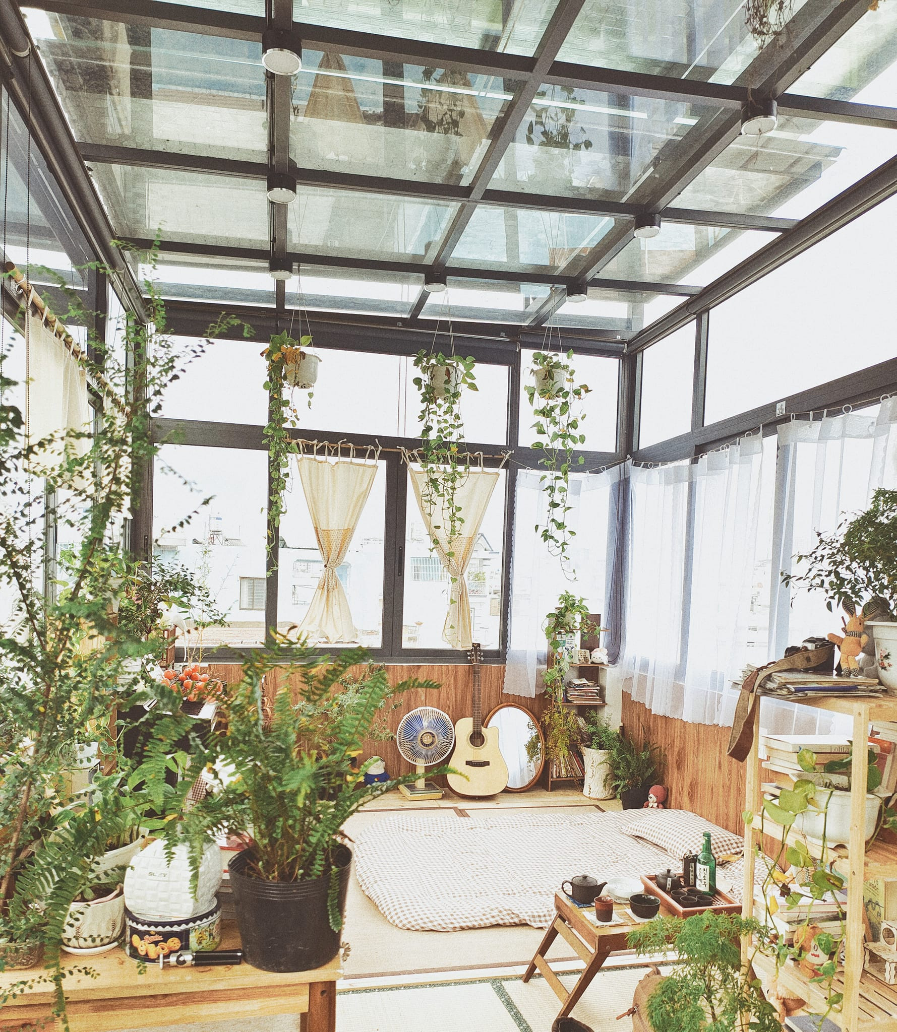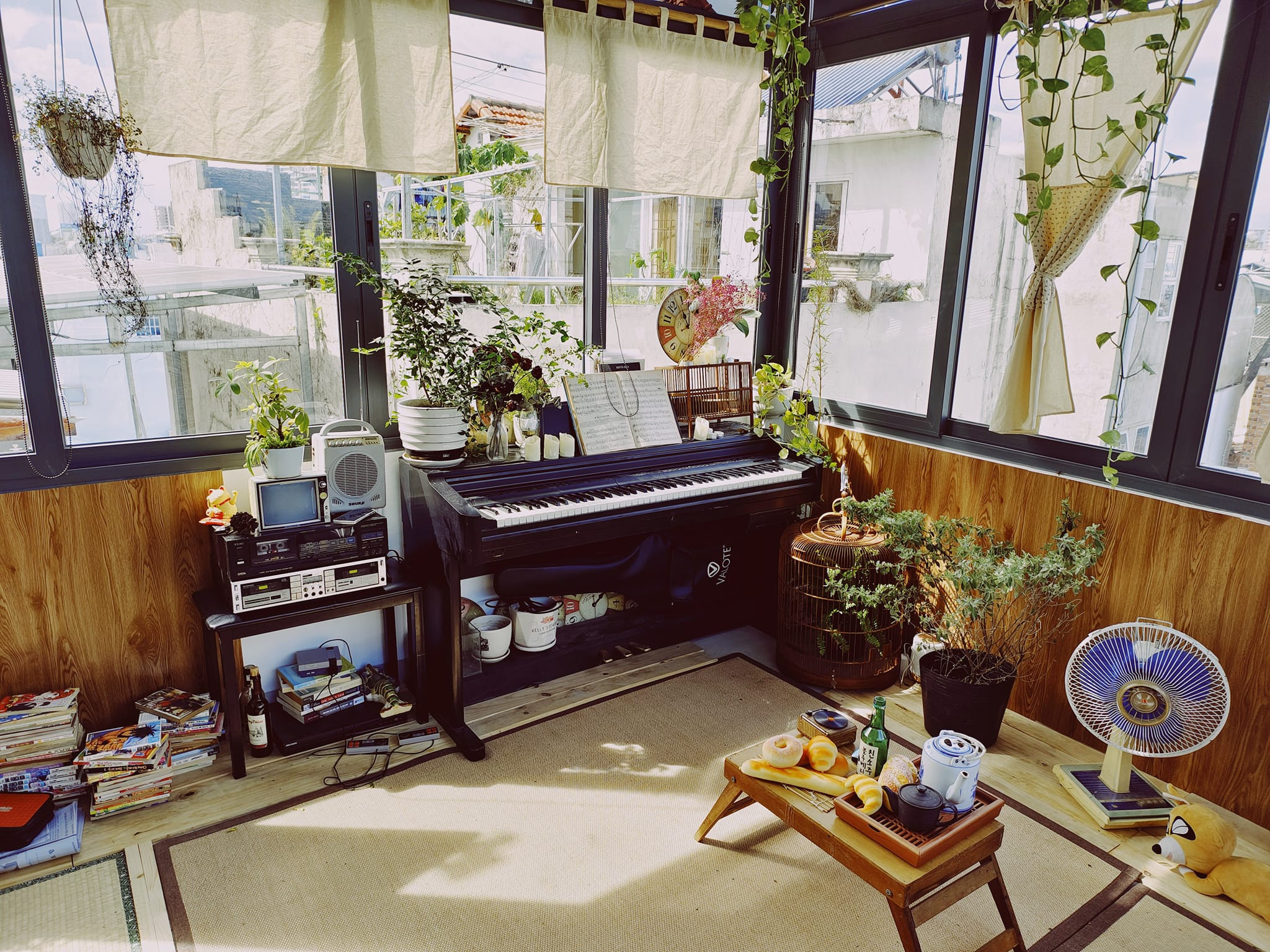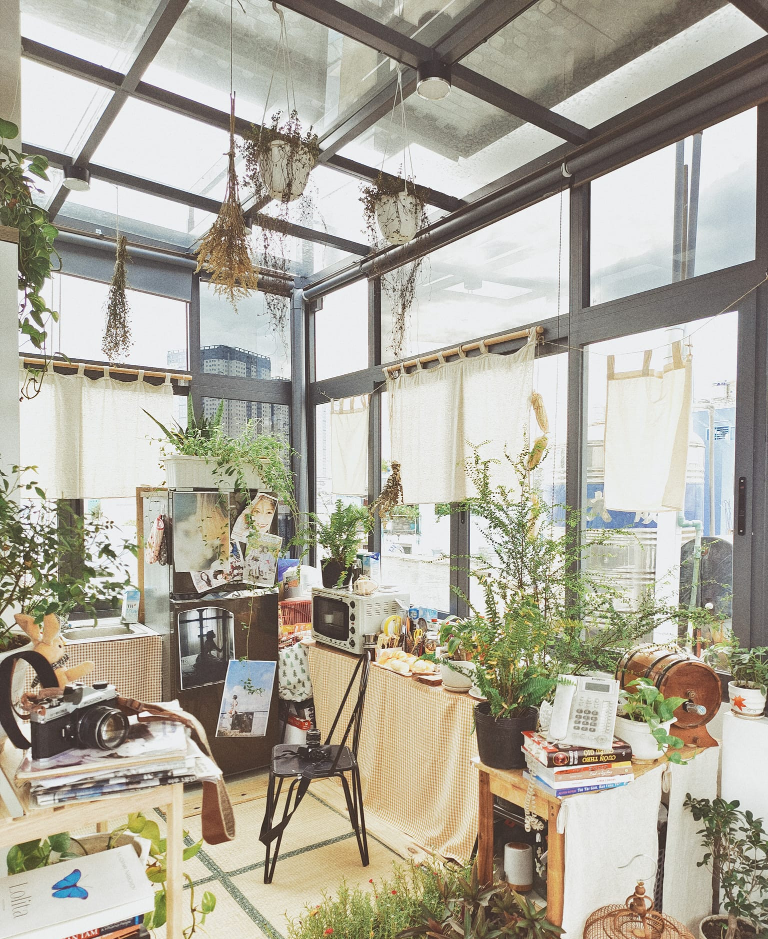 Anh decor toàn bộ từng góc theo tone vàng và gỗ, có đôi chút lộn xộn, có mảng xanh vì thích nhìn mầm cây mỗi ngày mỗi lớn. Bao quanh phòng là 6 cửa sổ nên anh không sợ bí bách khi đêm về.