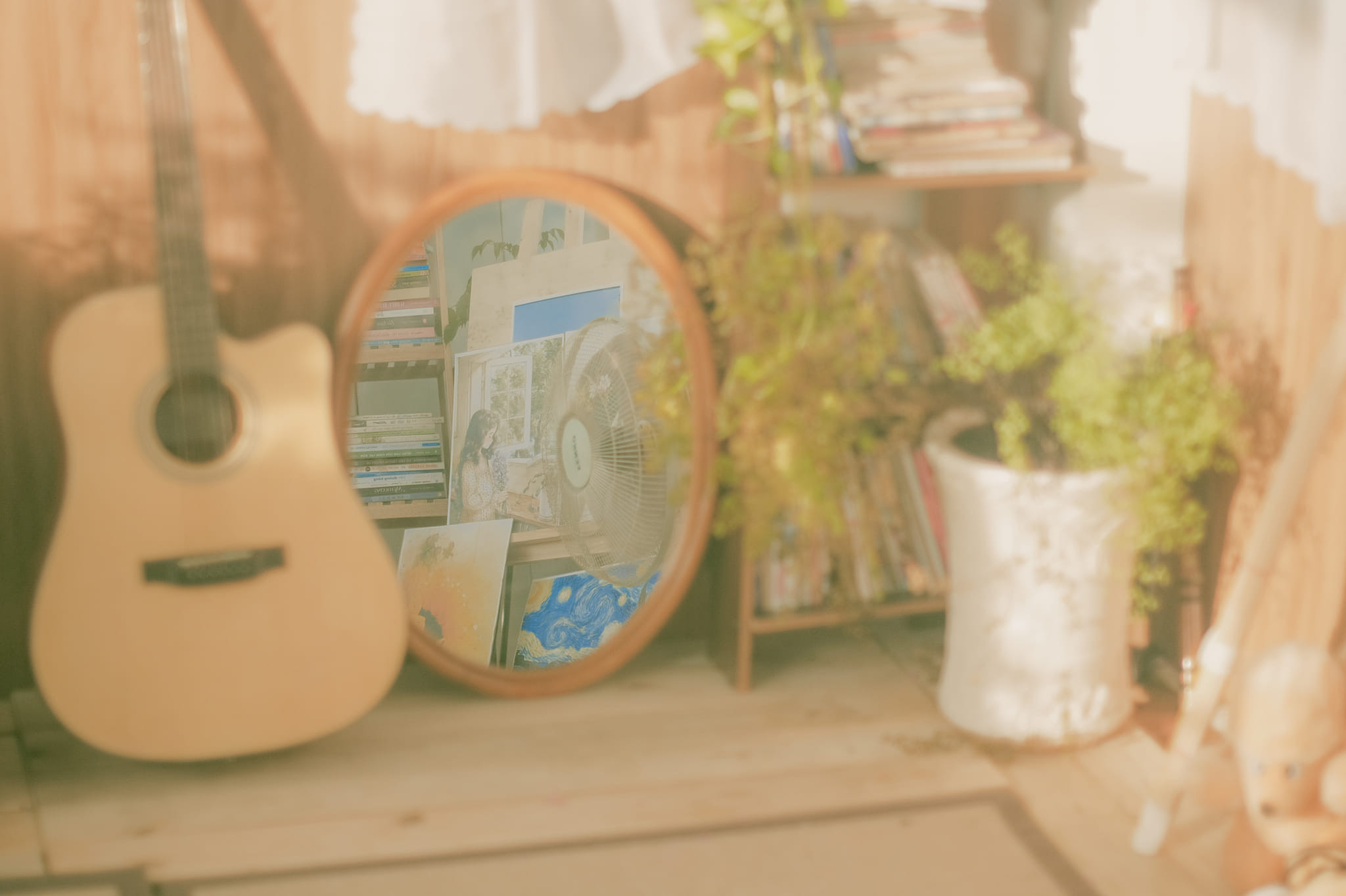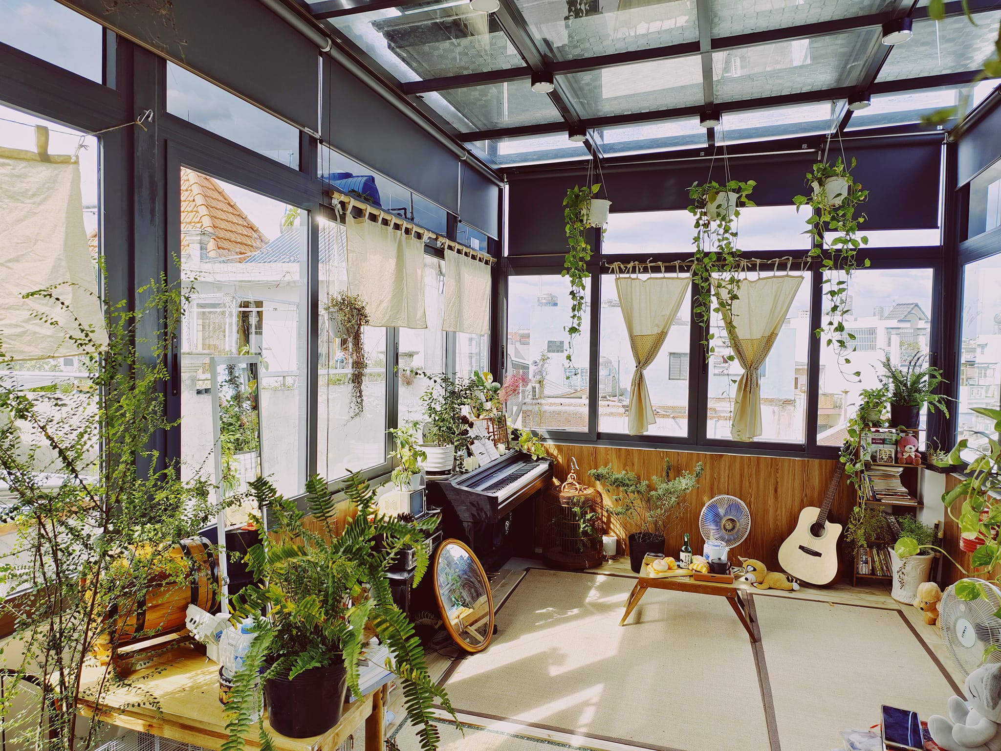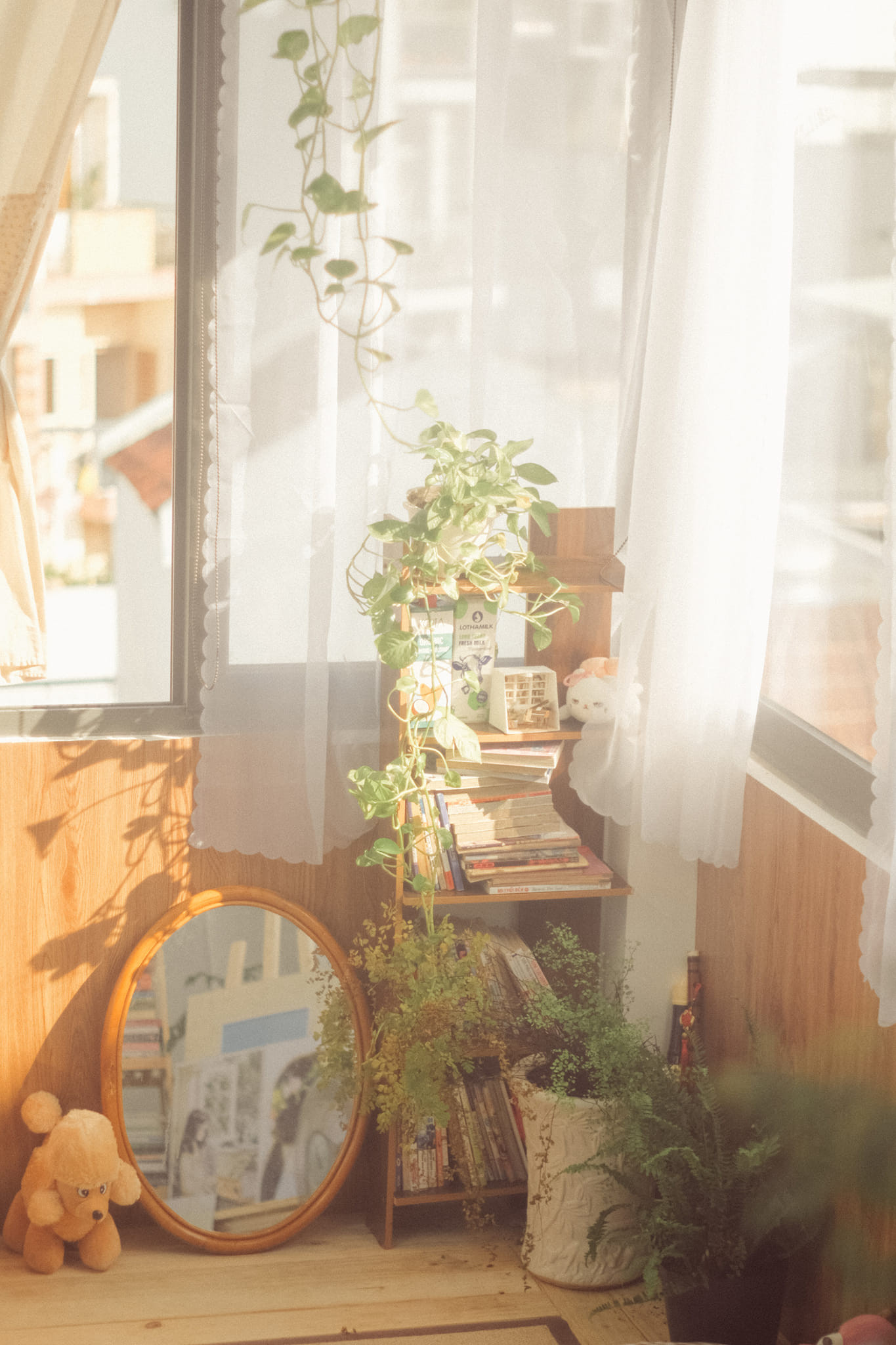 Anh decor toàn bộ từng góc theo tone vàng và gỗ, có đôi chút lộn xộn, có mảng xanh vì thích nhìn mầm cây mỗi ngày mỗi lớn. Bao quanh phòng là 6 cửa sổ nên anh không sợ bí bách khi đêm về.