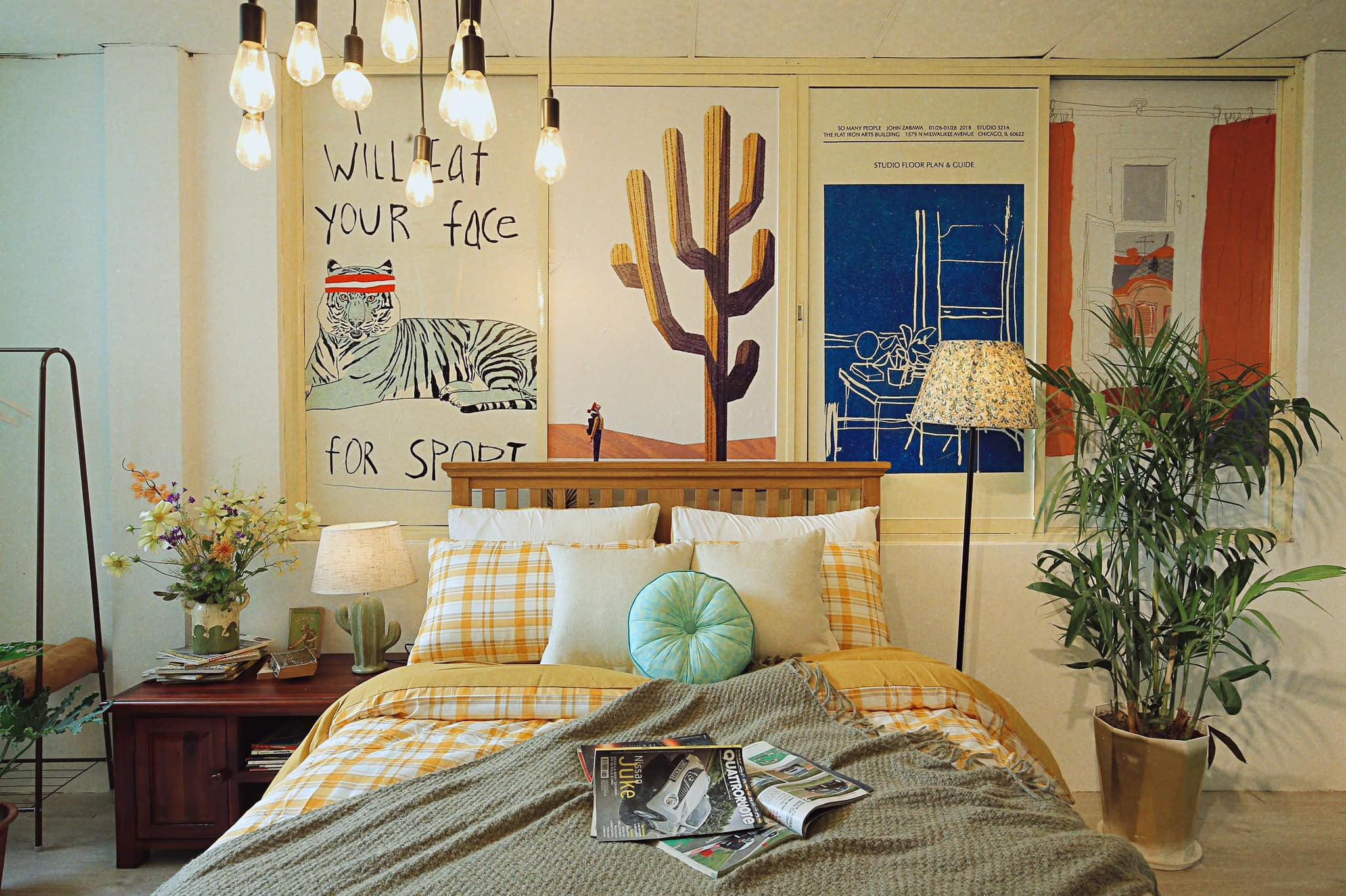 Điều chị tâm đắc nhất là bức tường treo tivi và góc đầu giường theo style Hàn nhưng rực rỡ hơn.