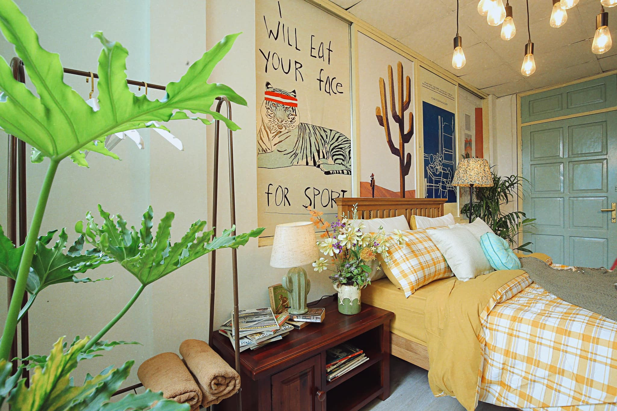 Tuy phòng nhỏ nhưng chị set đủ các góc xinh. Tường sơn trắng lại, chống thấm dột và sàn cũng tự dán. View cửa sổ sẽ ra dàn hoa giấy nhưng nếu hoa chưa nở sẽ là dàn xương rồng mới được trồng.