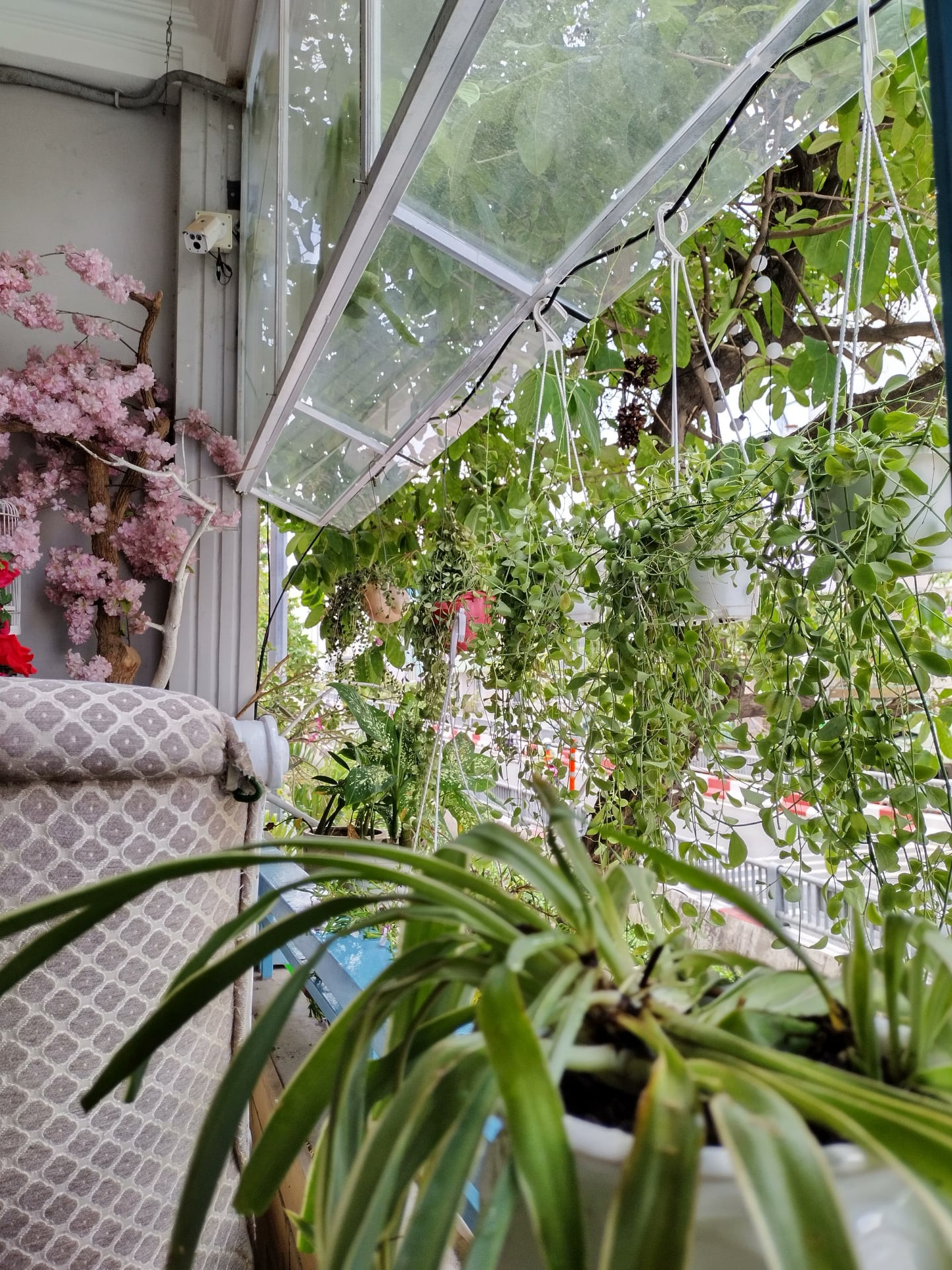 Trong nhà Hải Anh dùng cây giả, bên ngoài anh dùng cây thật để tăng sinh khí và lọc bụi.