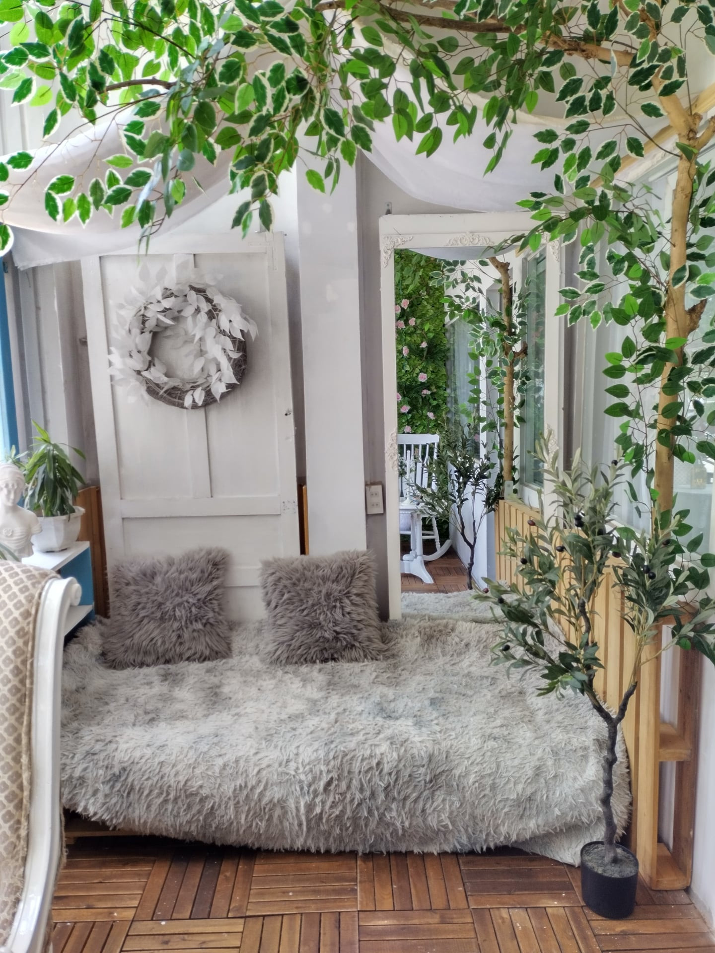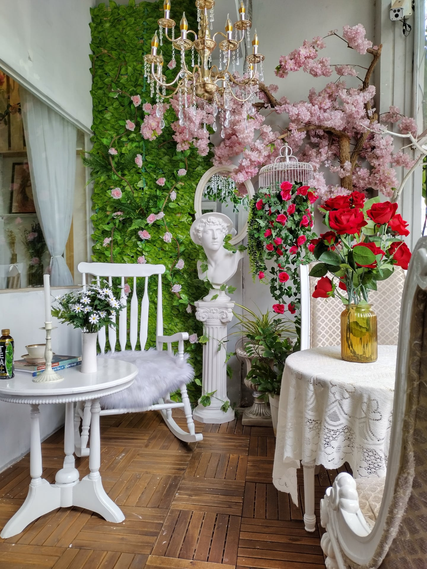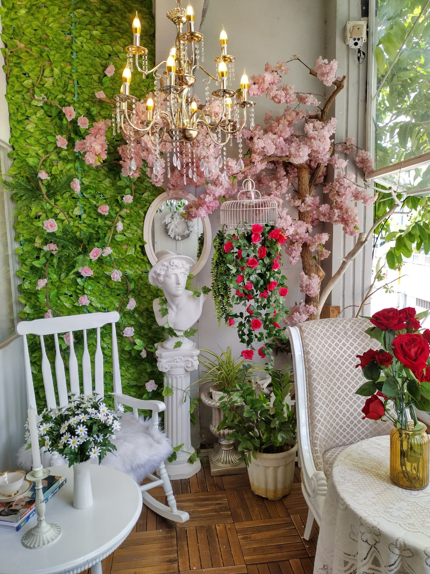 Góc trà chiều ngoài ban công, sàn ốp gỗ tinh tế kết hợp với vật dụng màu trắng càng thêm nổi bật. Hải Anh bố trí thêm hoa lá, cỏ giả để tạo sức cuốn hút và làm phông chụp ảnh lãng mạn.