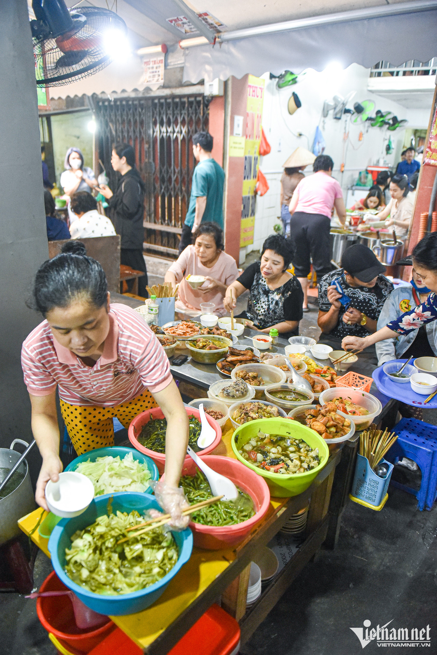 Hàng ngày bà Nhung cùng con mở hàng từ 7h sáng. "Bán ở đây có một cái tiện, làm tới đâu bán tới đó, hết đồ lại chạy ra chợ mua về chế biến. Vì thế mà đồ luôn tươi. Ví như thịt lợn, tôi cứ làm từng cân một, hết lại mua", bà Nhung nói.