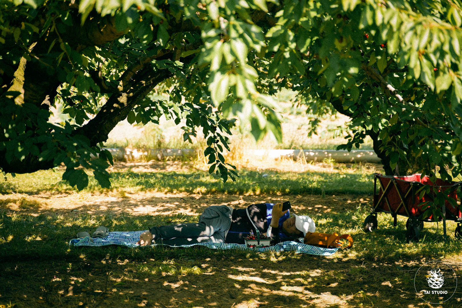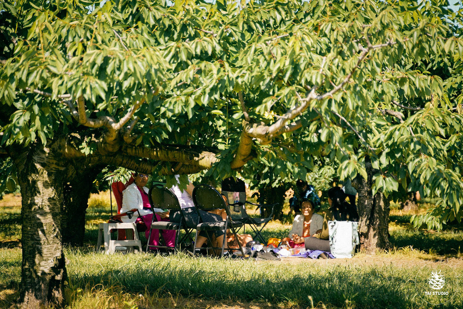 Nhiều du khách thích thú trải thảm, tổ chức buổi dã ngoại ngay trong nông trại, dưới gốc những cây cherry.