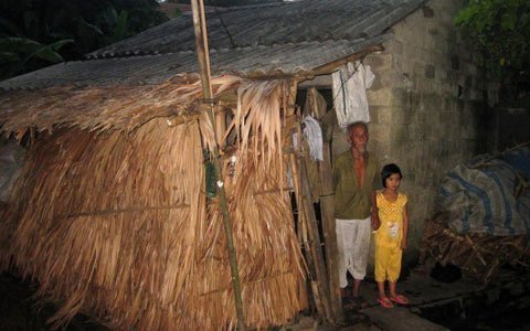 | Hai ông cháu trước túp lều nhỏ bé, dột nát |