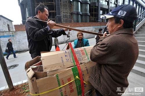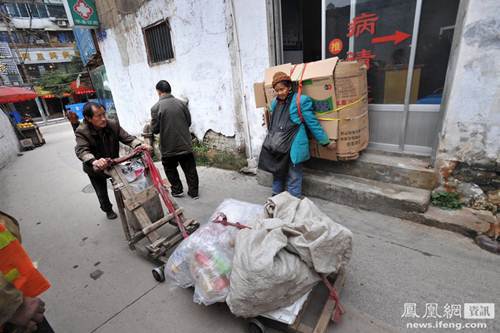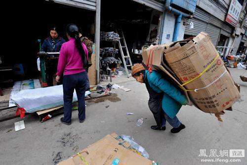 Cụ Đàm cõng đống bìa cát-tông trên lưng