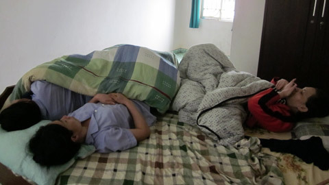 Sau giờ ăn trưa, các chị y tế về phòng trực còn các chị dọn phòng thì kiếm chỗ nghỉ ngơi. Trước khi dẫn chúng tôi vào căn phòng của một bệnh nhân, chị Vui và chị Bắc ngượng ngập: “Đợi chị vào trước một tý rồi hai đứa hãy vào”.