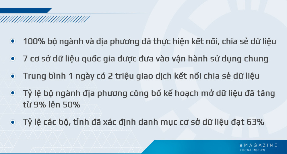 Theo Bộ TT&TT, nếu như năm 2020 mới có 10 triệu giao dịch kết nối chia sẻ dữ liệu, thì đến năm 2023 trung bình 1 ngày có 2 triệu giao dịch kết nối chia sẻ dữ liệu. Nhờ đó, đã có 528 thủ tục hành chính được đơn giản hoá, người dân chỉ phải khai báo một lần ví dụ như thủ tục sử dụng Bảo hiểm y tế khi đi khám chữa bệnh đã giảm thời gian từ 10 phút trước đây xuống còn dưới 10 giây. Thủ tục đăng ký mới doanh nghiệp, đã giảm từ 4 thủ tục riêng biệt mất 16 ngày xuống còn 1 thủ tục duy nhất mất trung bình 6 ngày.