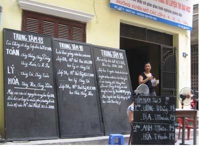 Kinh khủng hơn cả, quanh năm cổng các trường ĐH là một cái chợ theo nghĩa đen, nhan nhản quầy quảng cáo và lôi kéo thí sinh cho các "lò luyện" khủng khiếp nhất là mỗi khi kỳ thi đến.