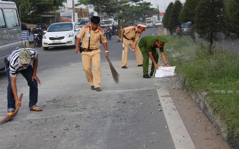 Các chiến sĩ CSGT nhanh chóng chạy vào nhà dân bên đường mượn chổi, xẻng thu dọn đá trên đường. Phải mất rất lâu quét dọn dưới trời nắng gắt, mặt đường mới được dọn sạch, trả lại sự thông thoáng.