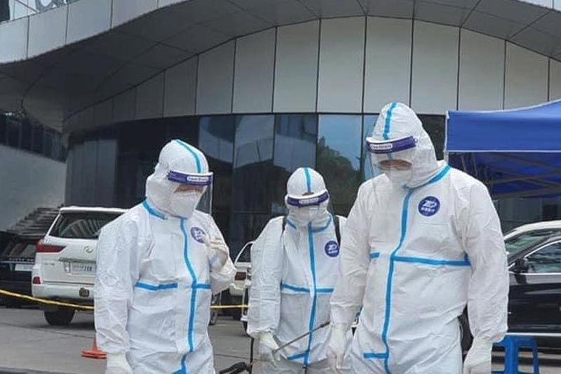 | Các nhân viên y tế Campuchia mặc đồ bảo hộ kín mít trong khi làm nhiệm vụ phòng chống dịch Covid-19. Ảnh: Sorm Pheaktra |