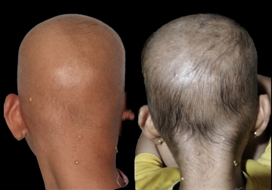 Do tác động của dịch bệnh, việc thăm khám cho trẻ phải chờ đến năm 2022 mới được thực hiện. Sau 9 tháng điều trị, trẻ đã mọc tóc trở lại.