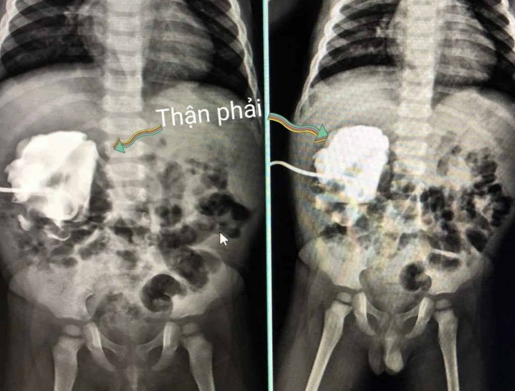 Đáng chú ý, quả thận này bị ứ nước nặng, giãn to chiếm nửa ổ bụng và đó chính là nguyên nhân gây nên tình trạng trẻ bị chướng bụng, căng cứng.