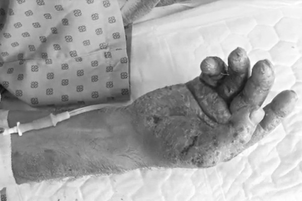 Khai thác bệnh sử cho thấy, ông bị viêm da cơ địa khoảng 2 năm nay, điều trị ổn định. Khi lòng bàn tay, chân nổi nhiều mụn nước ngứa ngáy khó chịu, ông đã dùng vật nhọn chích vỡ. Vài ngày sau, chân tay sưng lên, xuất hiện nhiều mụn mủ trắng đục và sốt.