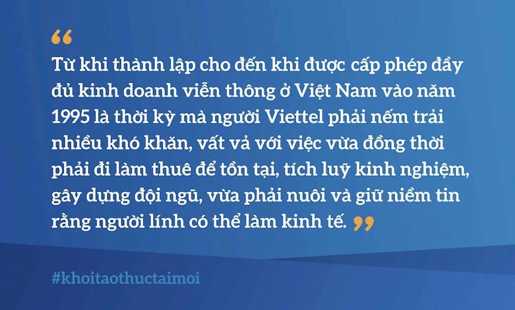 Nhìn lịch sử Viettel, có thể thấy, giai đoạn khó khăn nhất chính là khi bắt đầu thành lập (năm 1989) đến khi được cấp phép đầy đủ kinh doanh viễn thông ở Việt Nam vào năm 1995. Đây là thời kỳ mà Viettel phải nếm trải những khó khăn, vất vả với việc vừa đồng thời phải đi làm thuê để tồn tại, tích luỹ kinh nghiệm, gây dựng đội ngũ, vừa phải nuôi và giữ niềm tin rằng người lính có thể làm kinh tế.