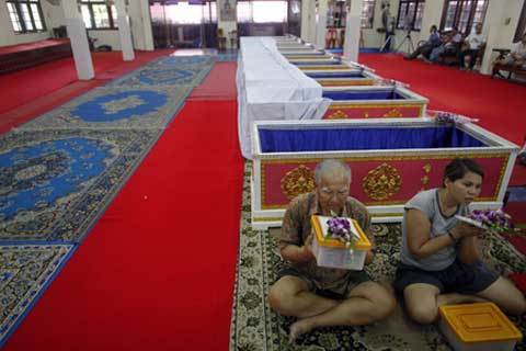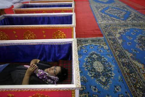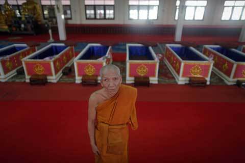 trăm tín đồ đạo Phật lần lượt trèo vào 9 chiếc quan tài được đặt sẵn ở chùa Wat