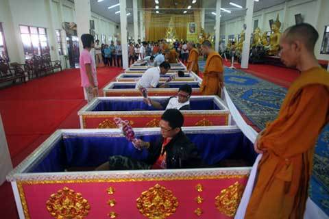 Với một khoản phí nhỏ, một người sẽ có cơ hội được chết đi rồi sống lại nhằm có một khởi đầu mới cho cuộc sống. Buổi lễ chết thử kỳ dị diễn ra tại chùa Wat Prommanee, Thái Lan.