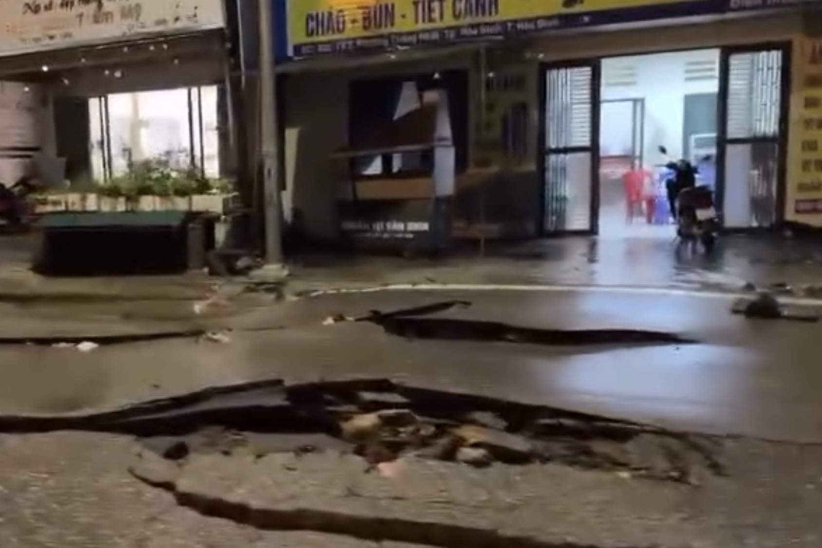 Sau trận mưa lớn kéo dài nhiều giờ, một số đoạn đường An Dương Vương (TP Hòa Bình, tỉnh Hòa Bình) bị nứt gãy, biến dạng nghiêm trọng.